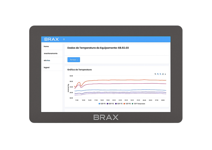 A BraxCloud oferece análise e monitoramento avançados. Acesse pela internet ou localmente pela IHM Brax para acompanhar em tempo real a performance e saúde dos seus ativos, receber alertas e visualizar tendências.